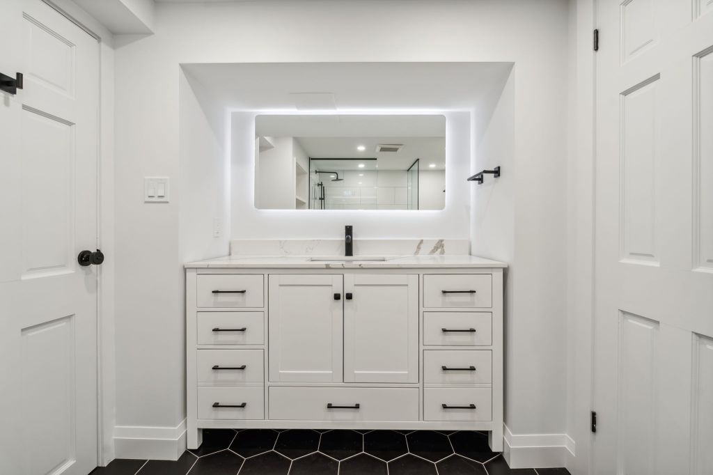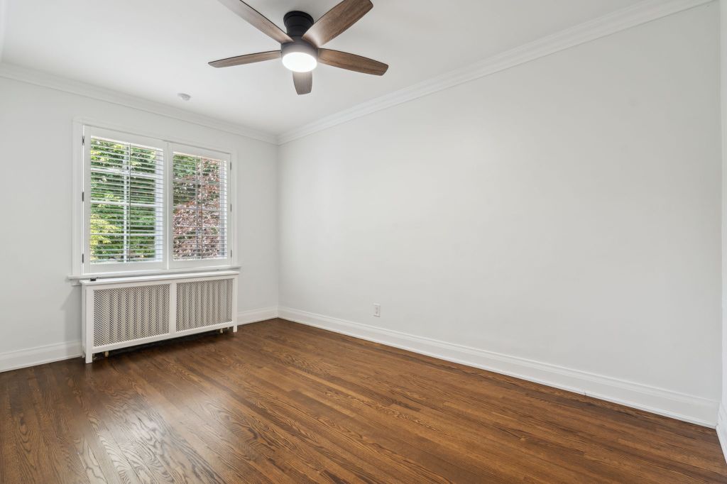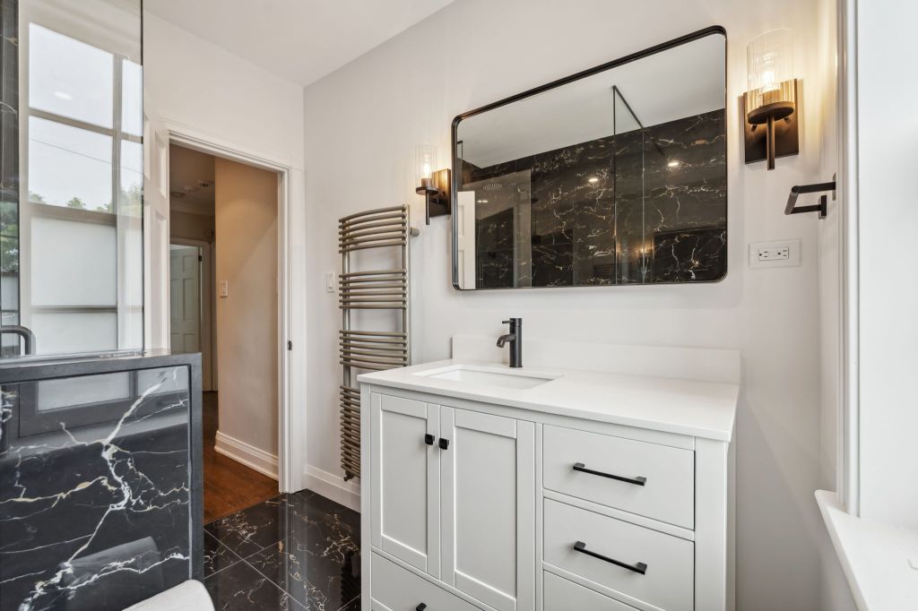 A sophisticated single-family rental home featuring newly renovated bathrooms, stainless steel appliances, private fenced-in backyard with large deck and shed, elegant custom built-ins, spacious finished basement with laundry room, air-conditioning, garage entry with mudroom, and generous storage.